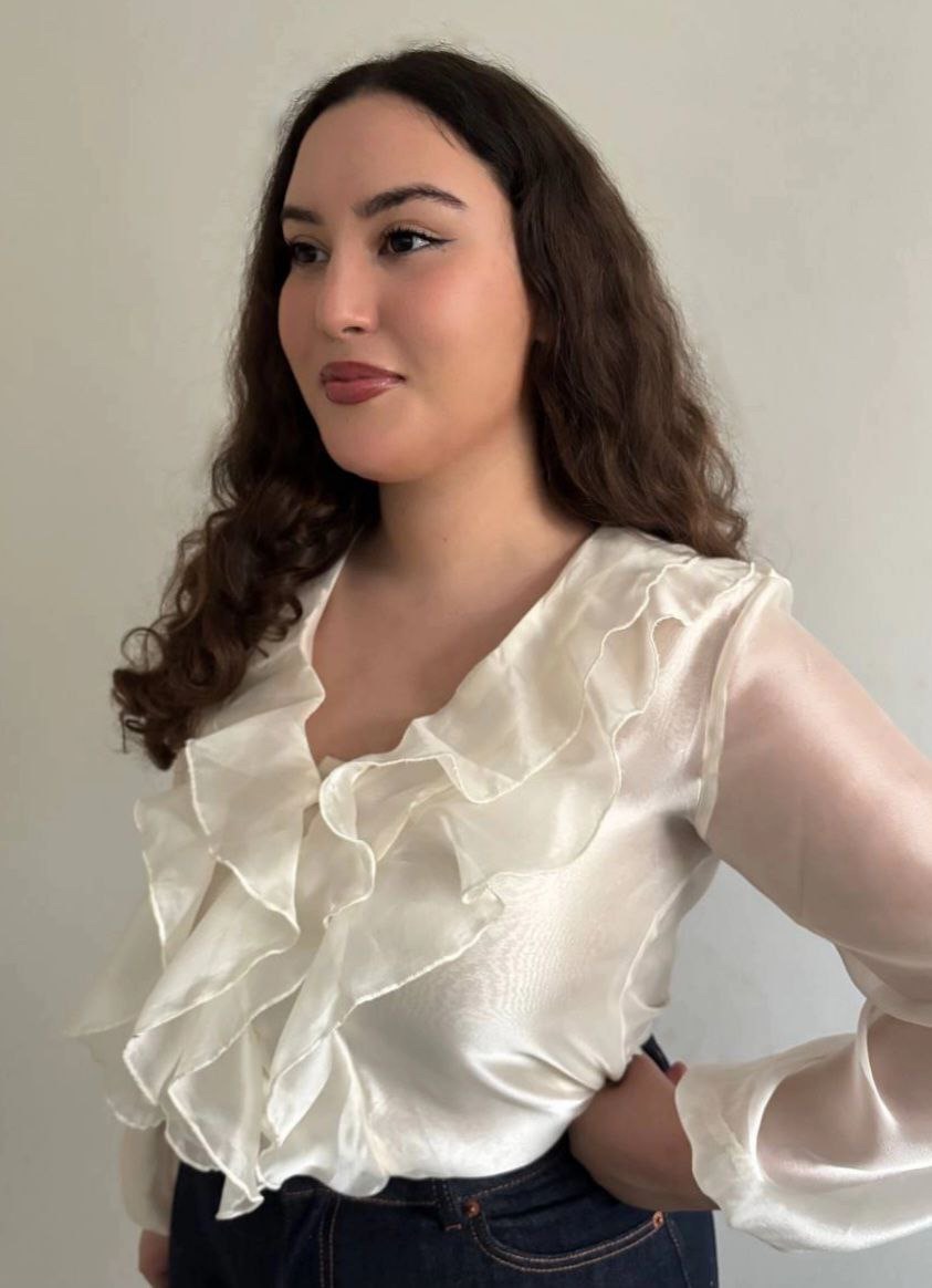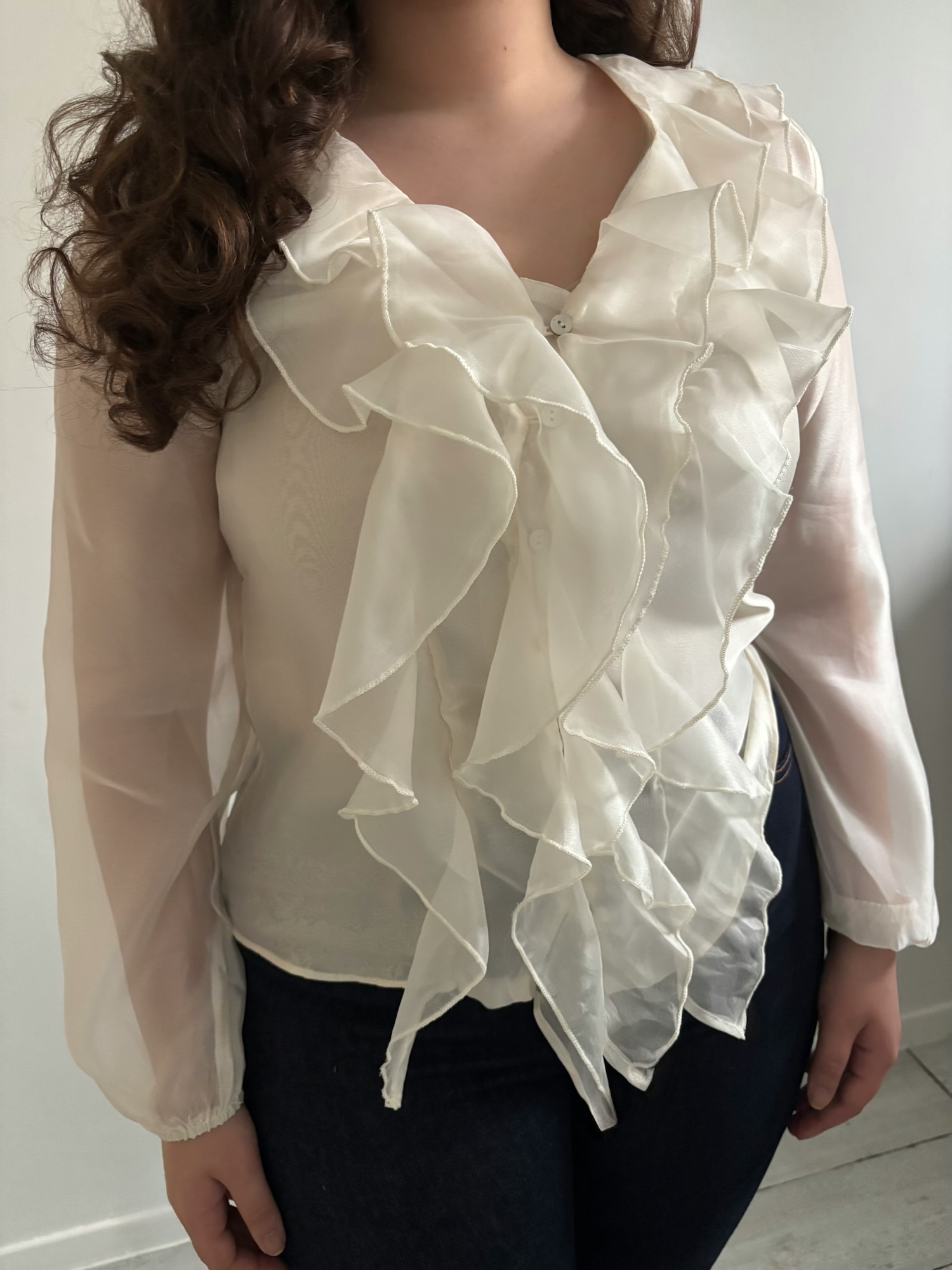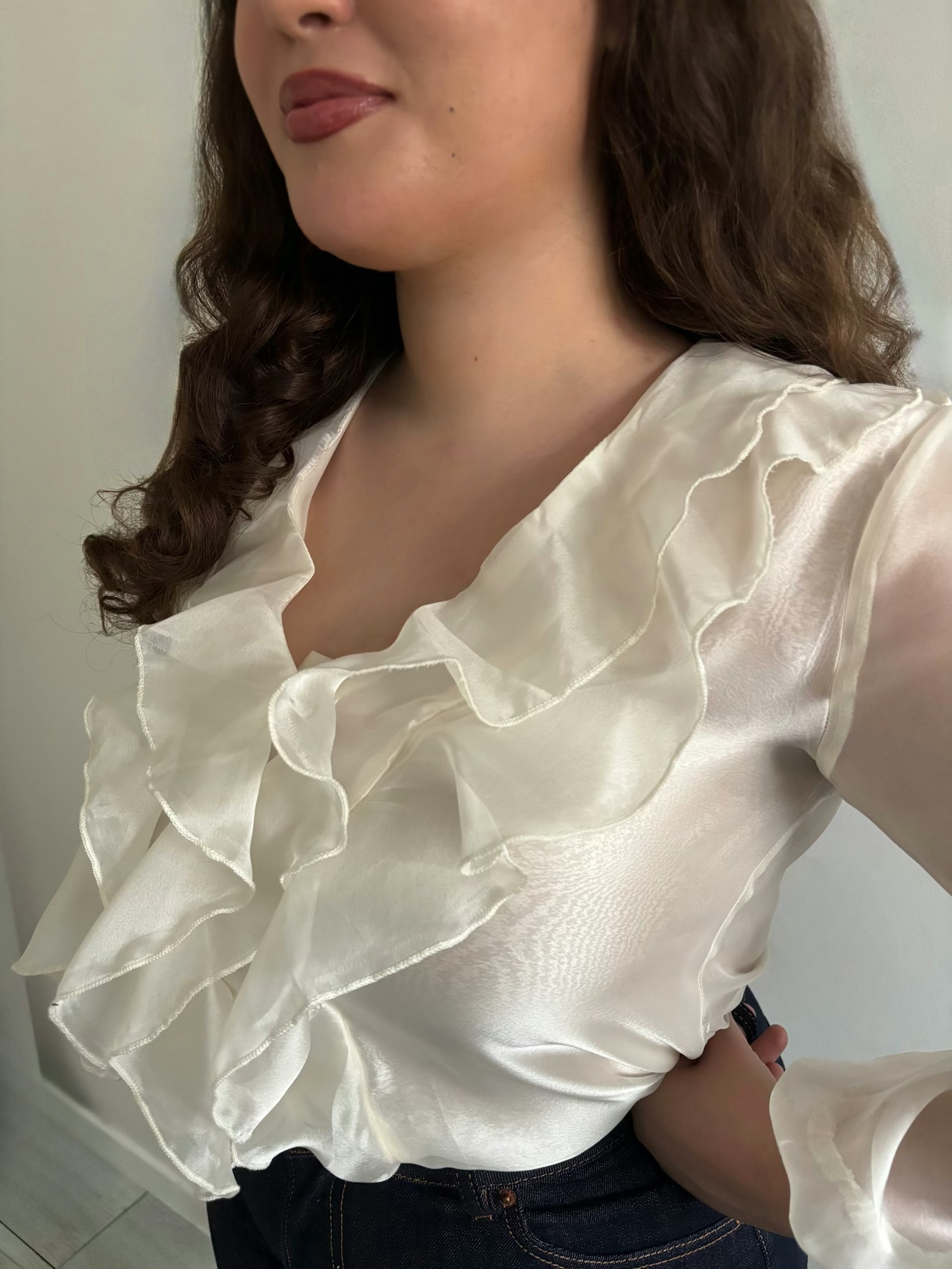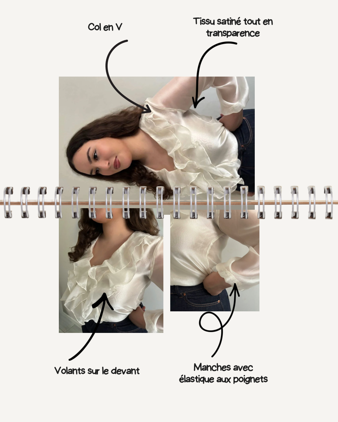 Blouse écru en tissu satiné tout en transparence, col en V élégant, manches avec élastique et volants délicats. Chic, légère et féminine.