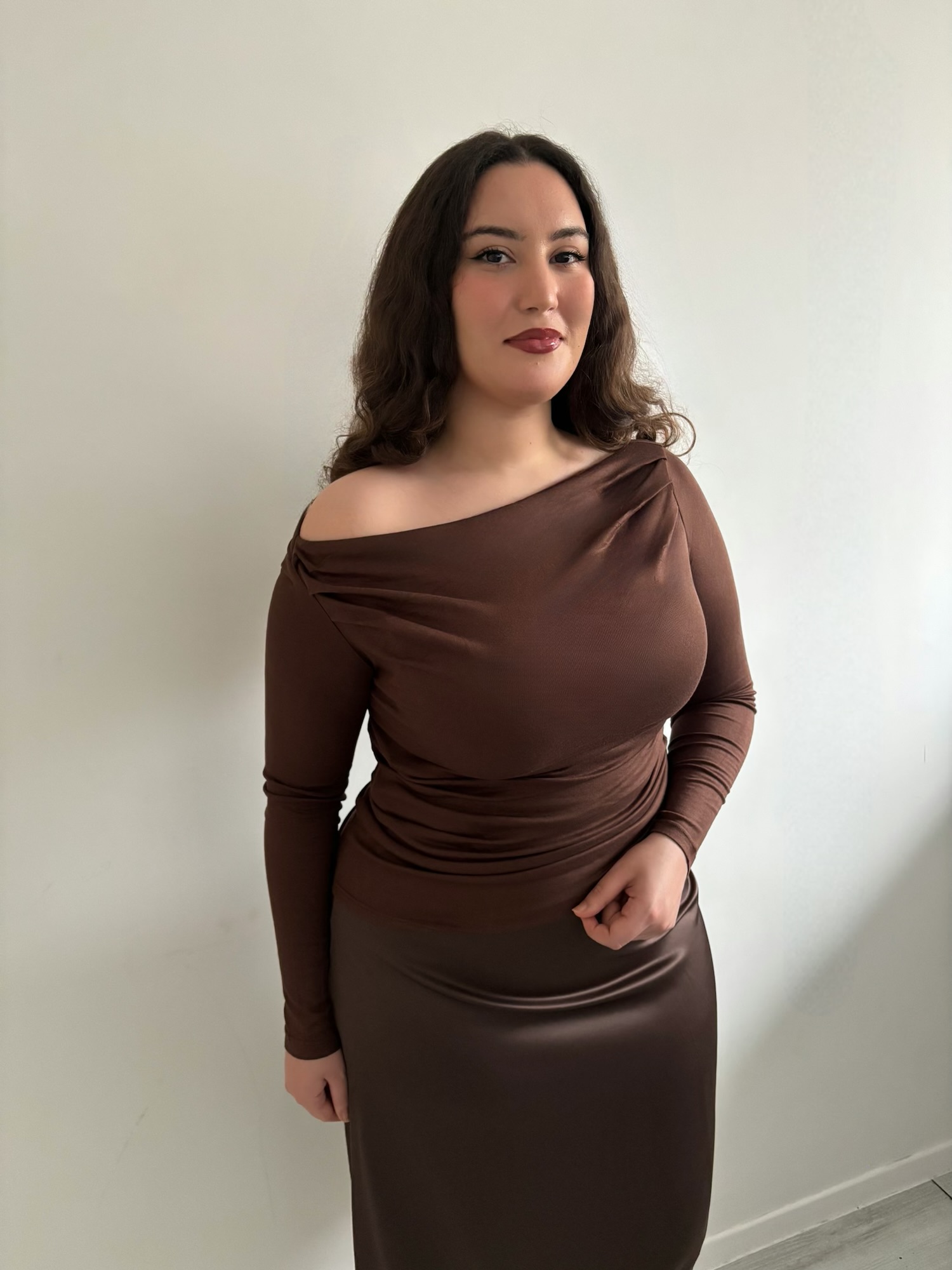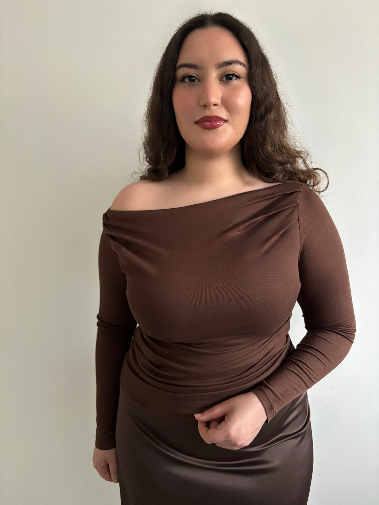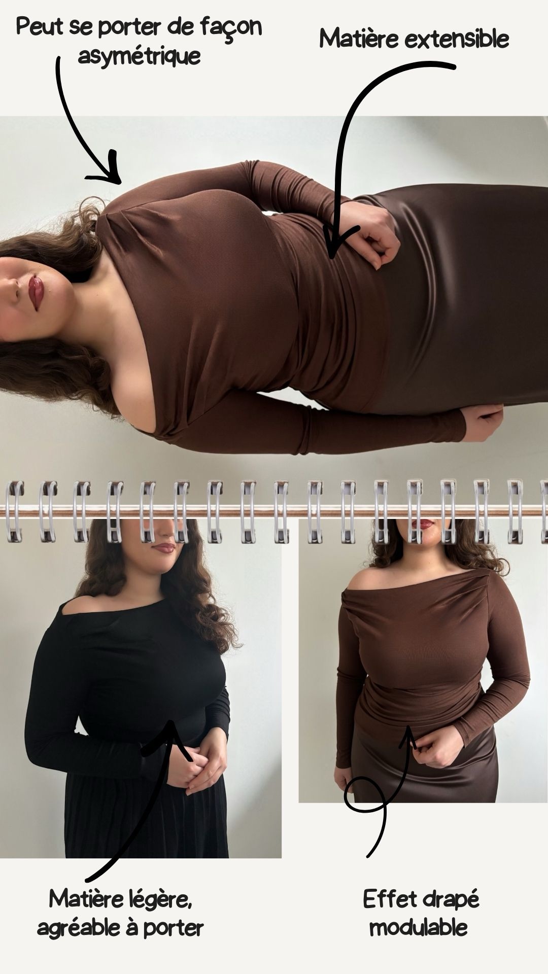 Haut drapé disponible, matière douce, légère et extensible, drapé modulable aux épaules pour un porté asymétrique, avec effet drapé ajustable sur le devant.