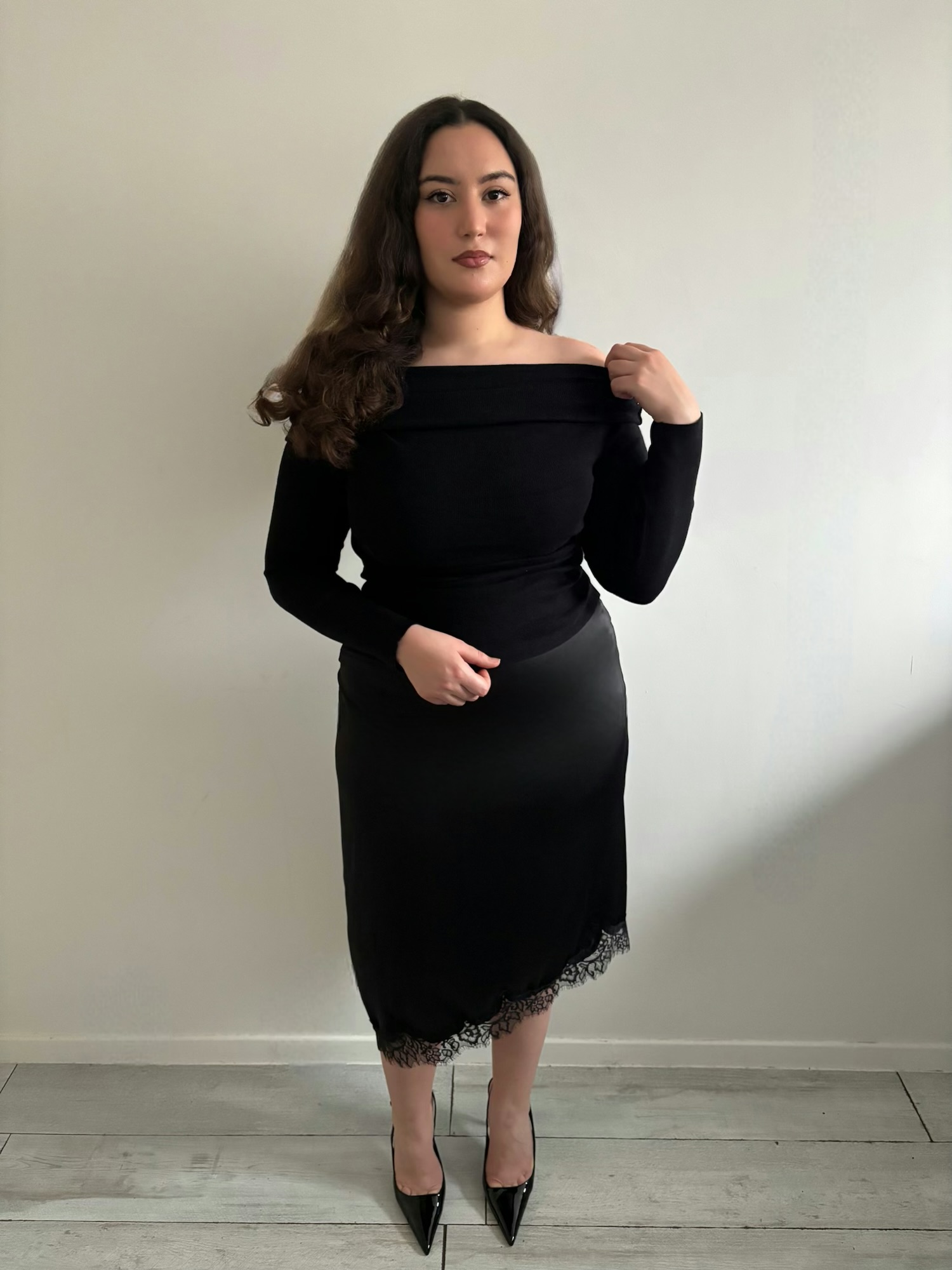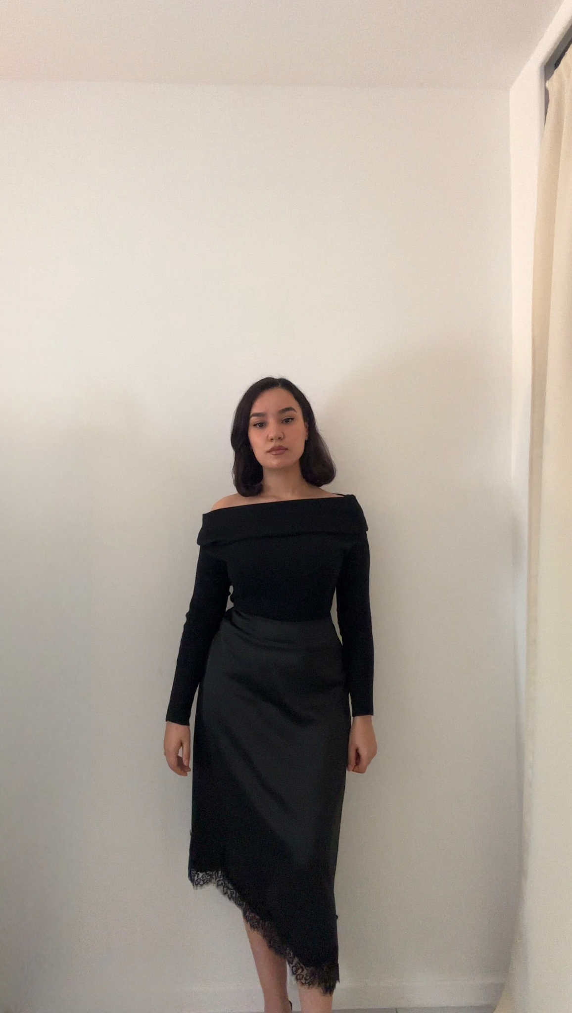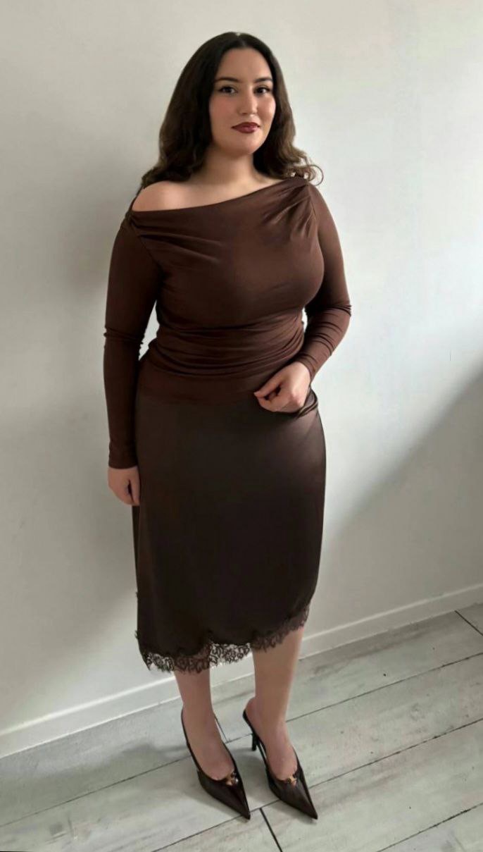 Jupe midi en satin fluide, à coupe asymétrique, rehaussée d’une dentelle délicate à l’ourlet.