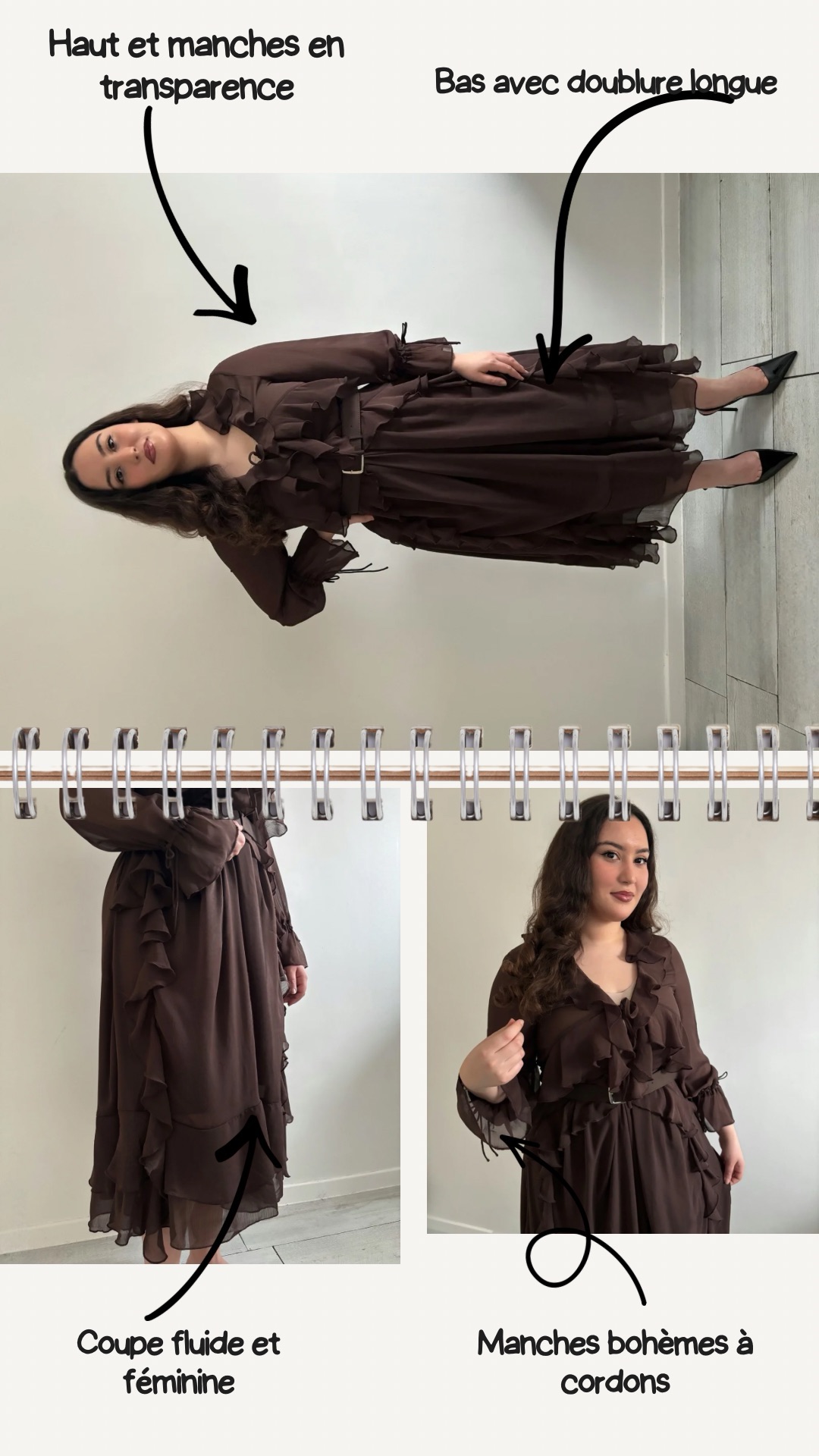 Bas avec doublure longue, haut et manches subtilement transparents, manches bohèmes à cordons ajustables, coupe fluide et féminine.